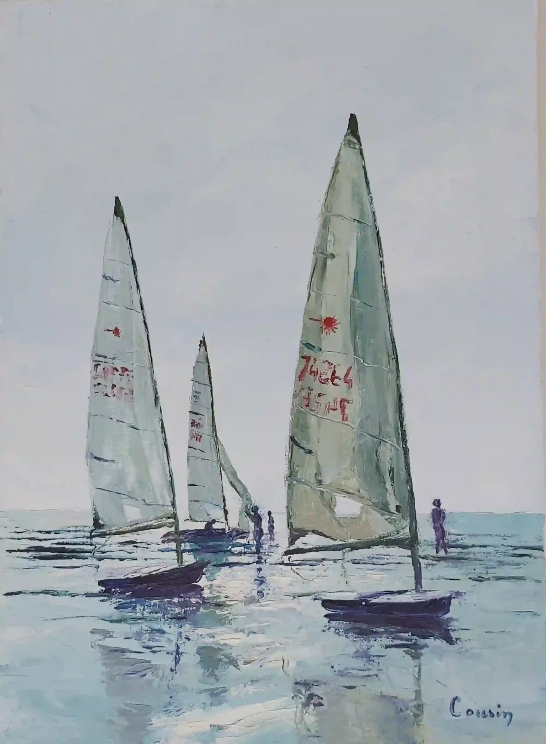 Trois voiles blanches à Jullouville (50-Manche) marée basse, mer calme. Huile sur toile au couteau 46x33cm