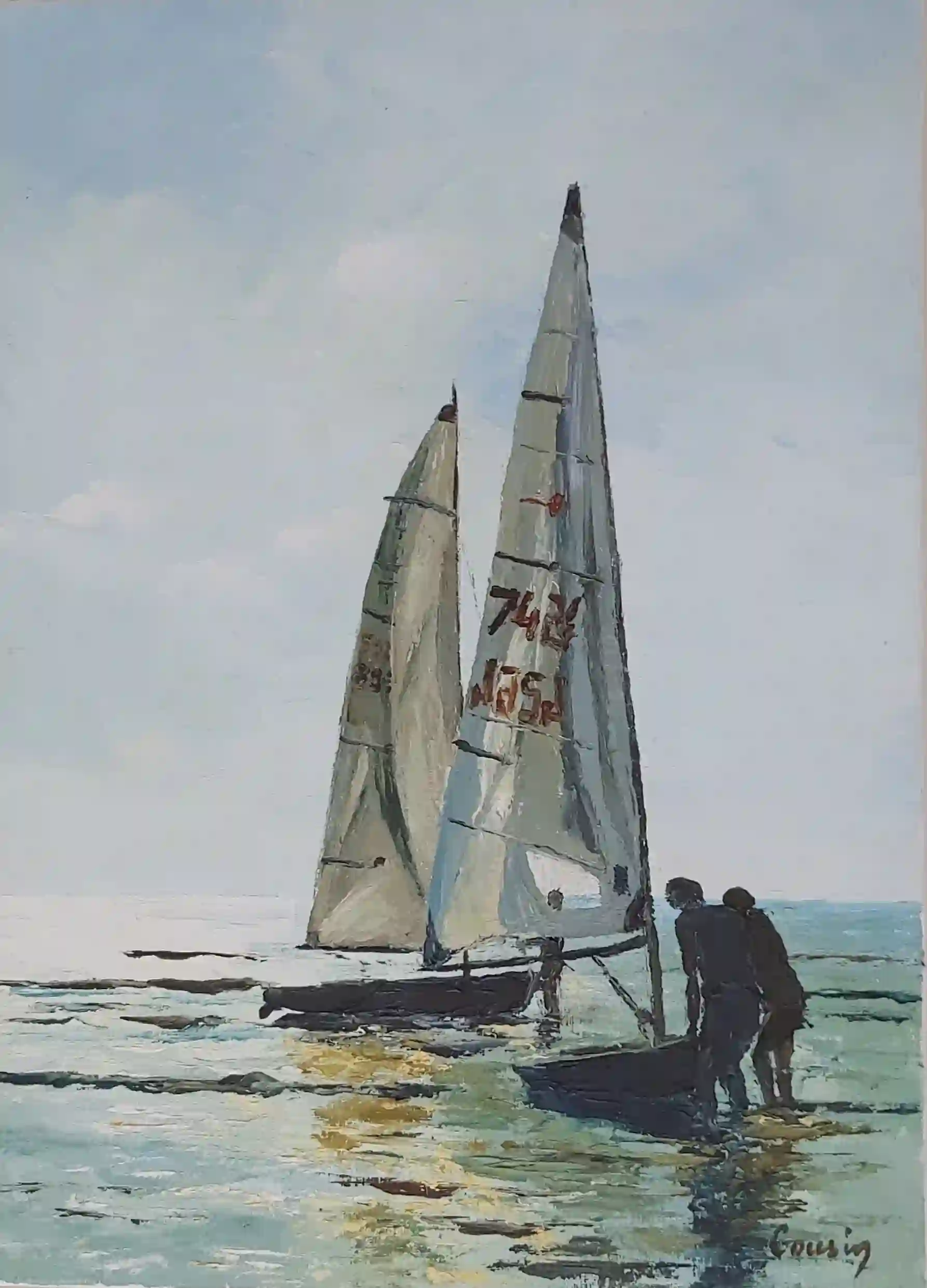 Deux voiles blanches à Jullouville (50-Manche) marée basse, mer calme. Huile sur toile au couteau 46x33cm