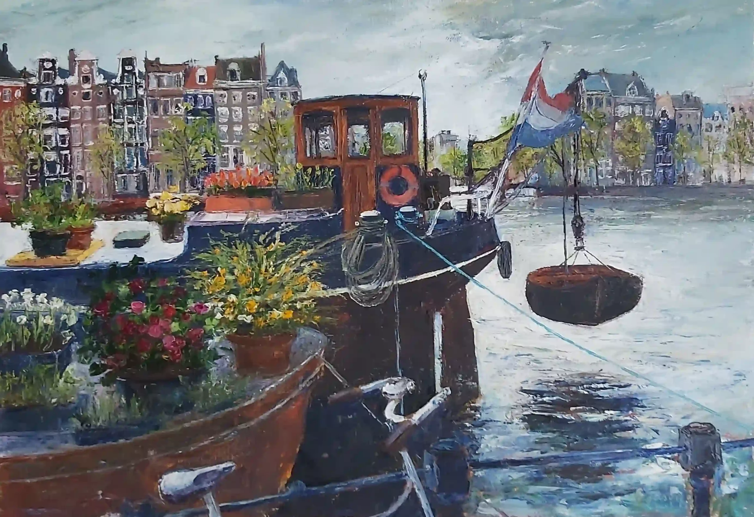 Au port d’Amsterdam Huile sur toile au couteau 38x55cm