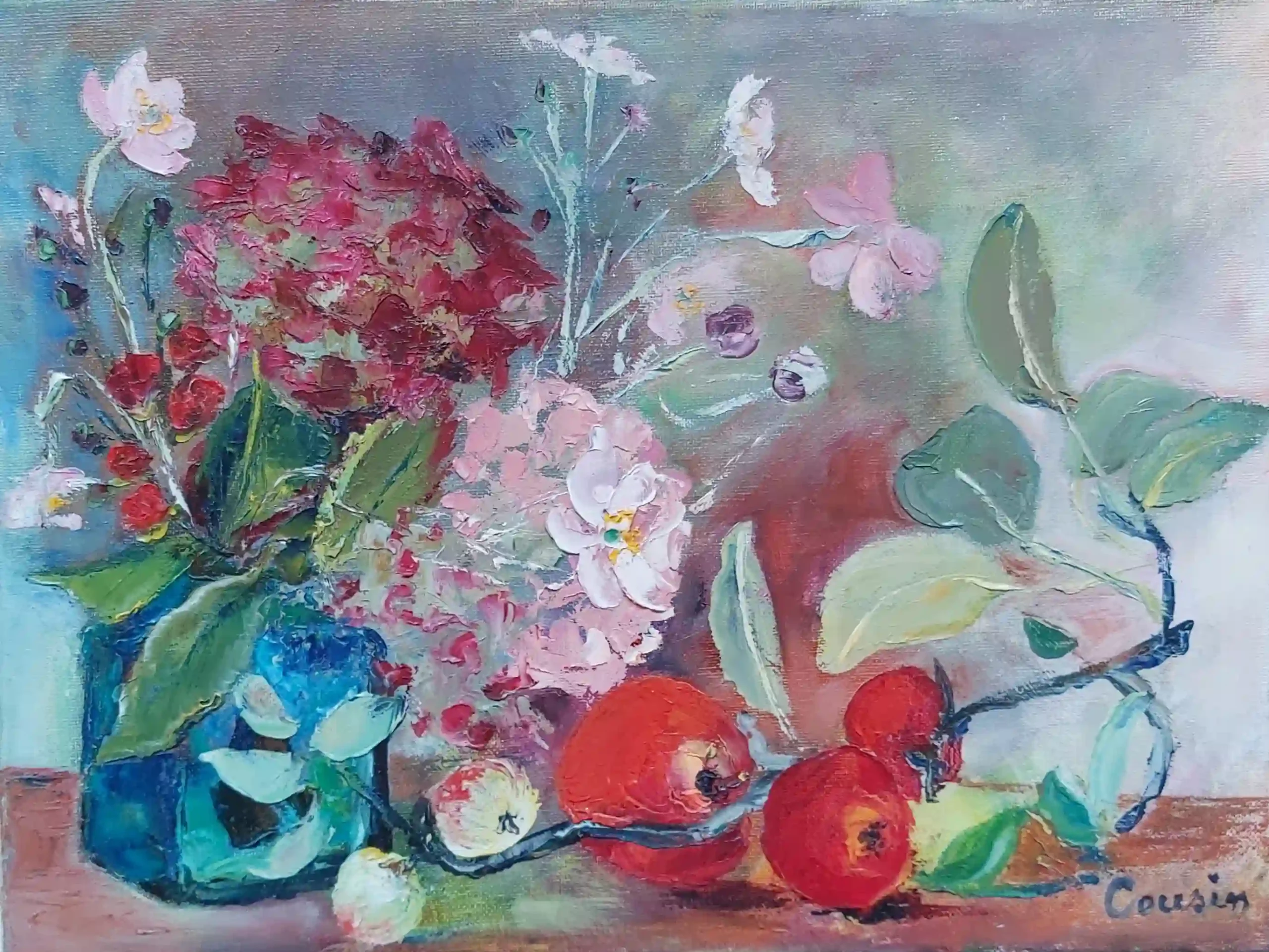 Huile au couteau sur toile 30x40cm. Pommes rouges et vase d’hortensias
