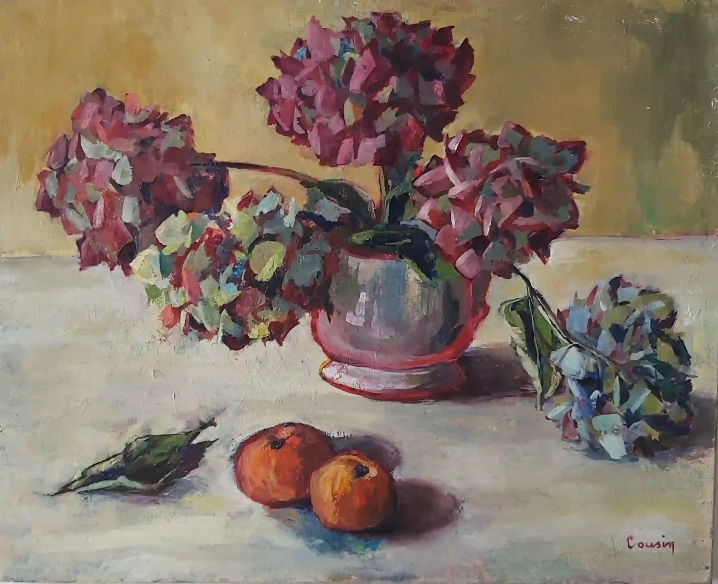 Huile au couteau sur toile 50x61cm. Dahlias roses et bleus