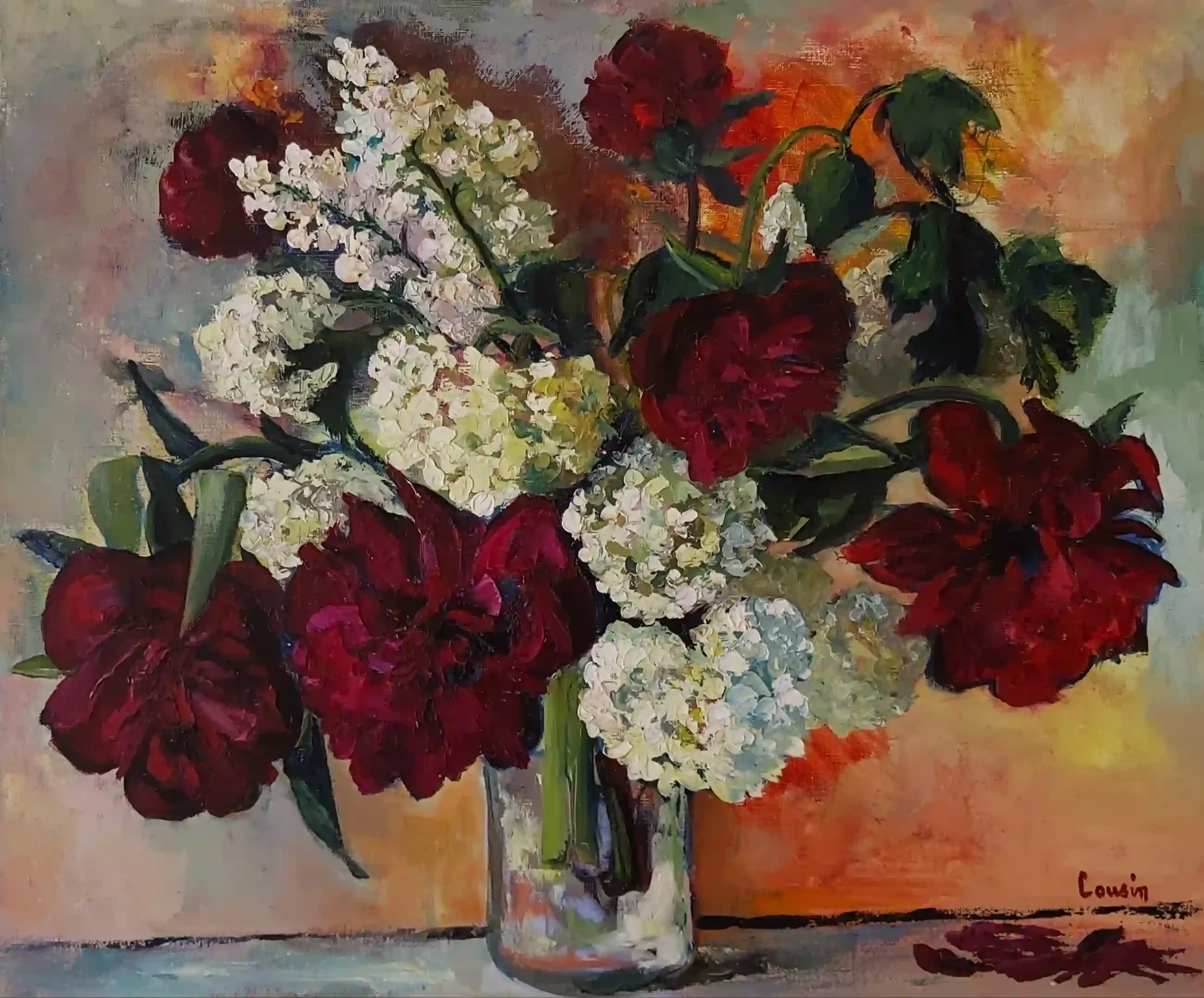 Huile au couteau sur toile 50x61cm. Pivoines et lilas blanc