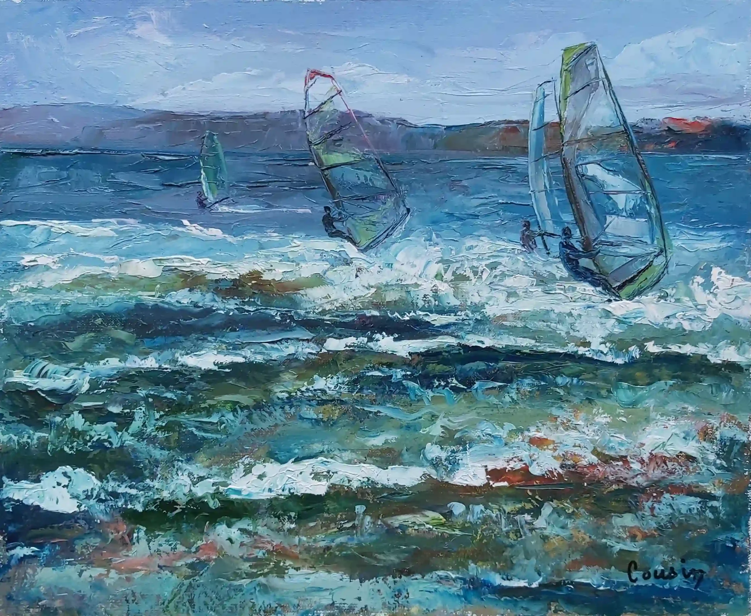 Planches à voiles. Huile au couteau sur toile 38x46cm