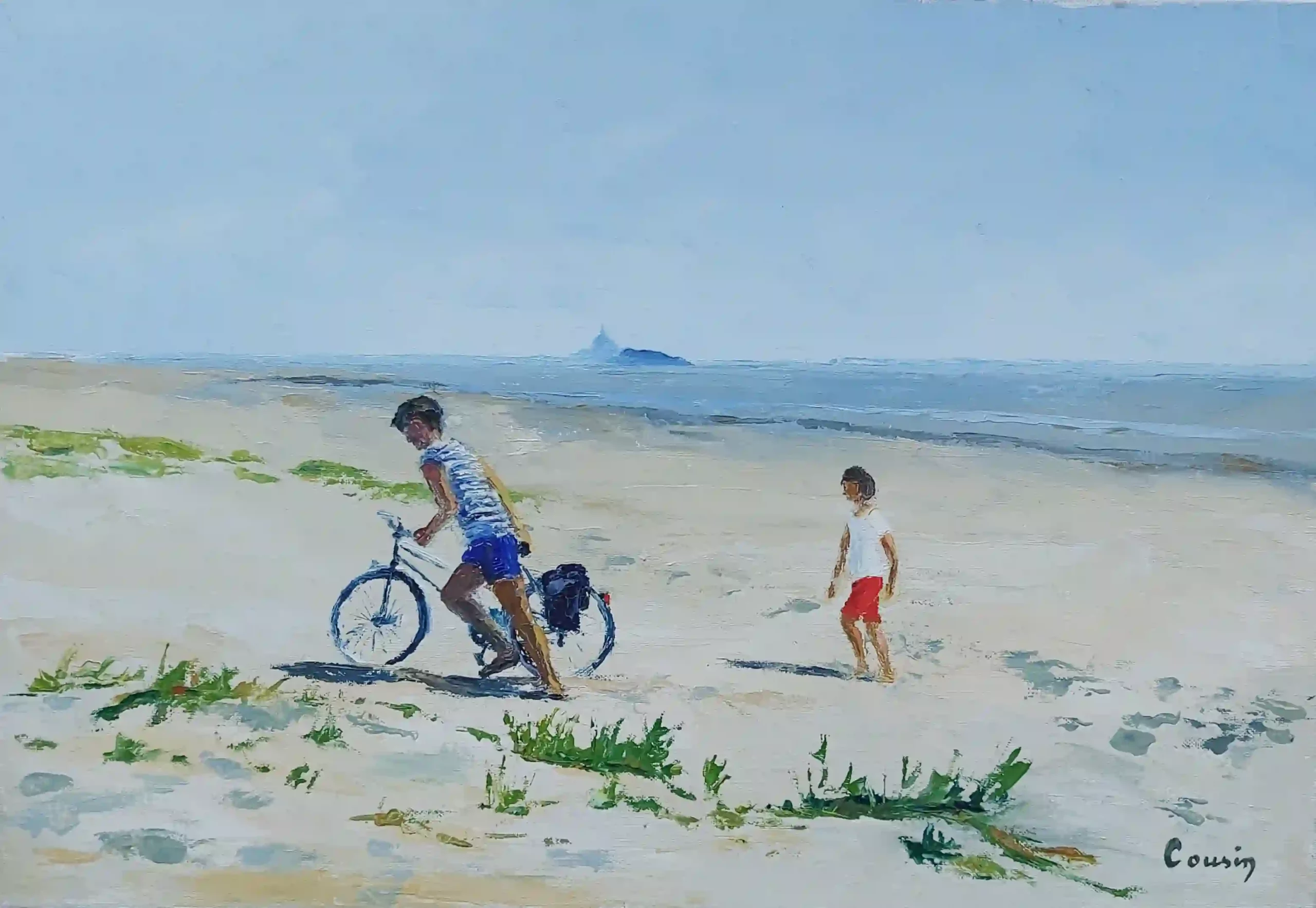 Remontée de plage à vélo. Huile au couteau sur toile 38x55cm