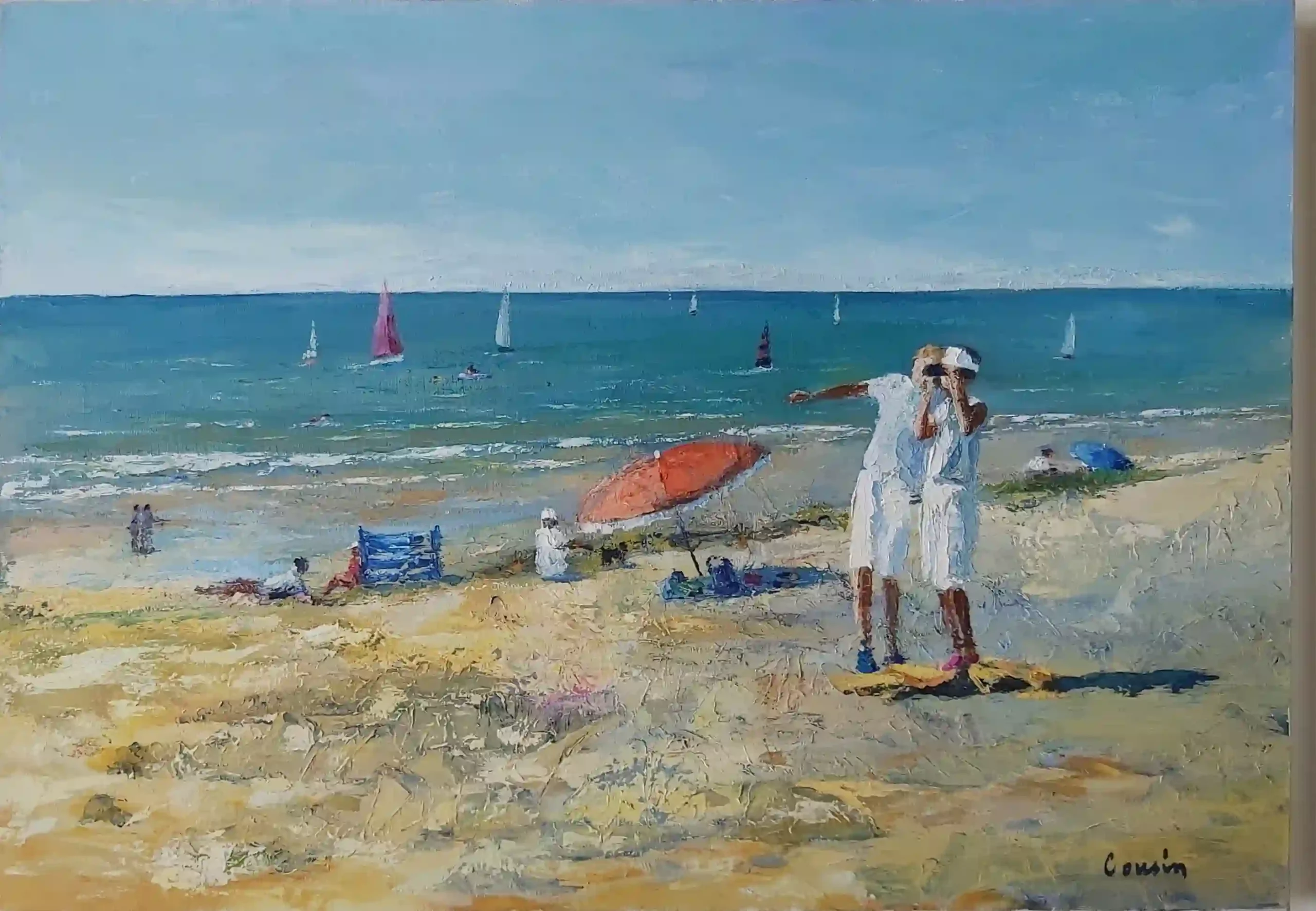 Richard et Claire sur la plage de Jullouville. Huile au couteau sur toile 46x65cm