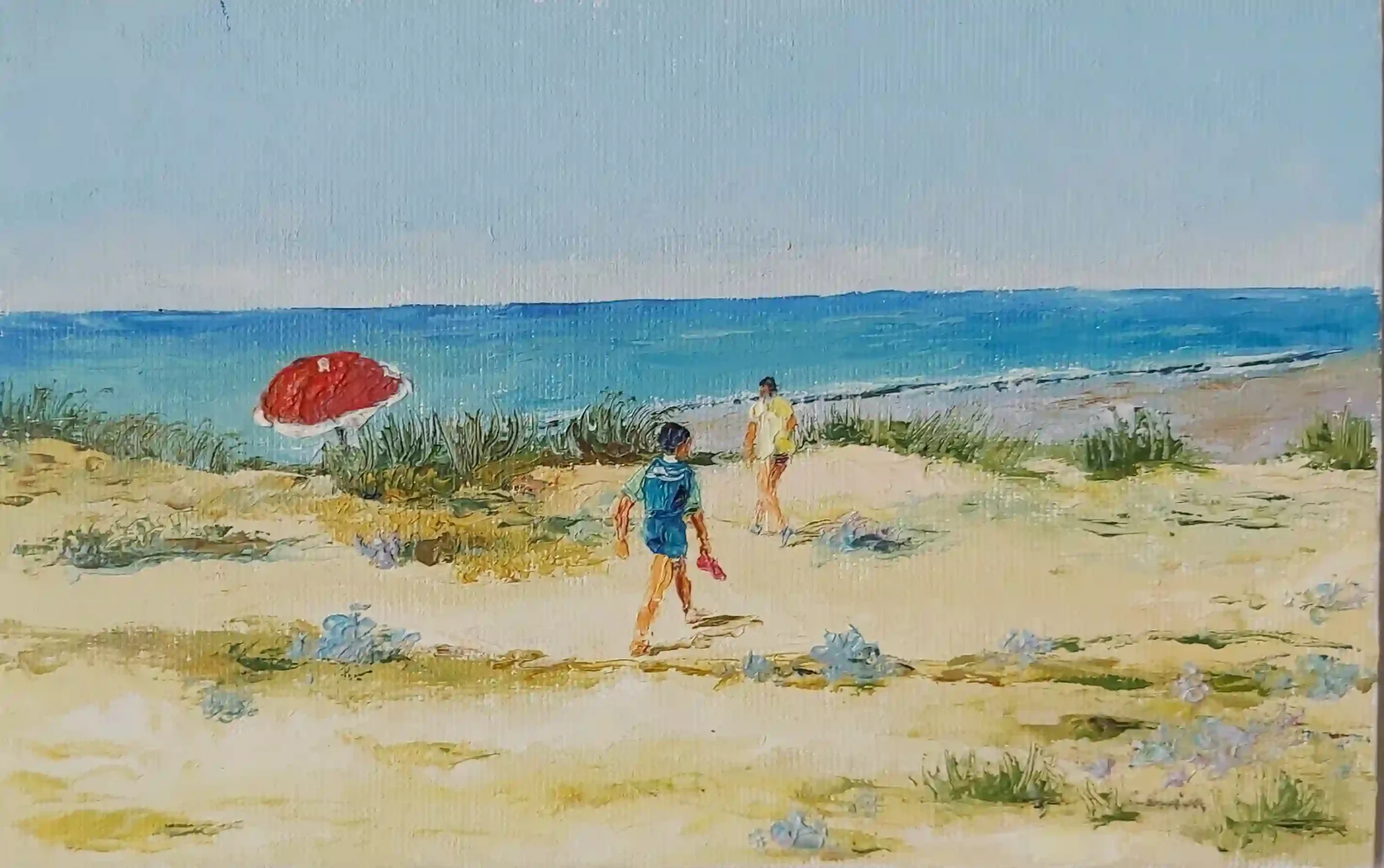 Plage de Carolles. Huile au couteau sur toile 14x22cm