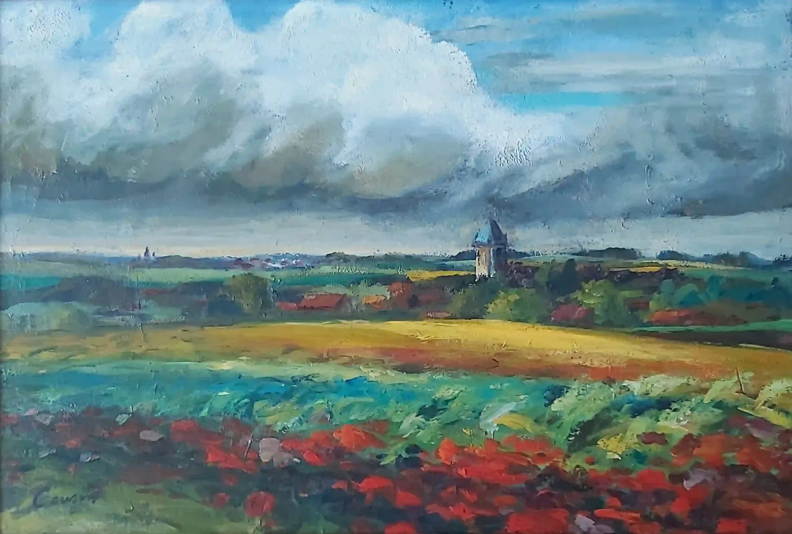Huile au couteau sur toile 34x51cm. Clocher dans la campagne du nord